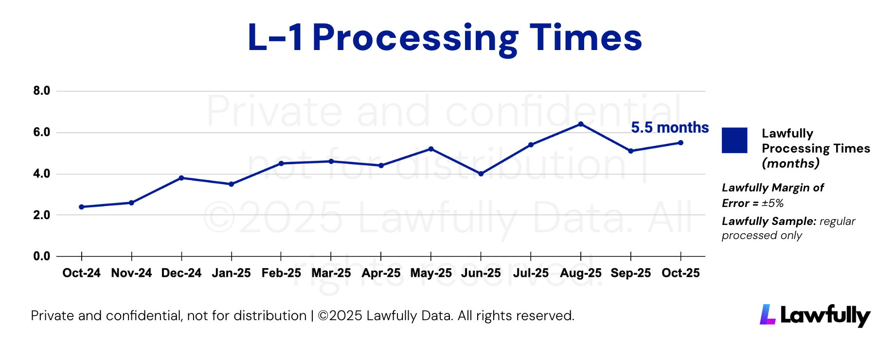 📈 New Data: Another small sneak peek from Lawfully Intelligence. L-1 processing times at USCIS—across L-1A and L-1B—have been rising steadily since Oct 2024.