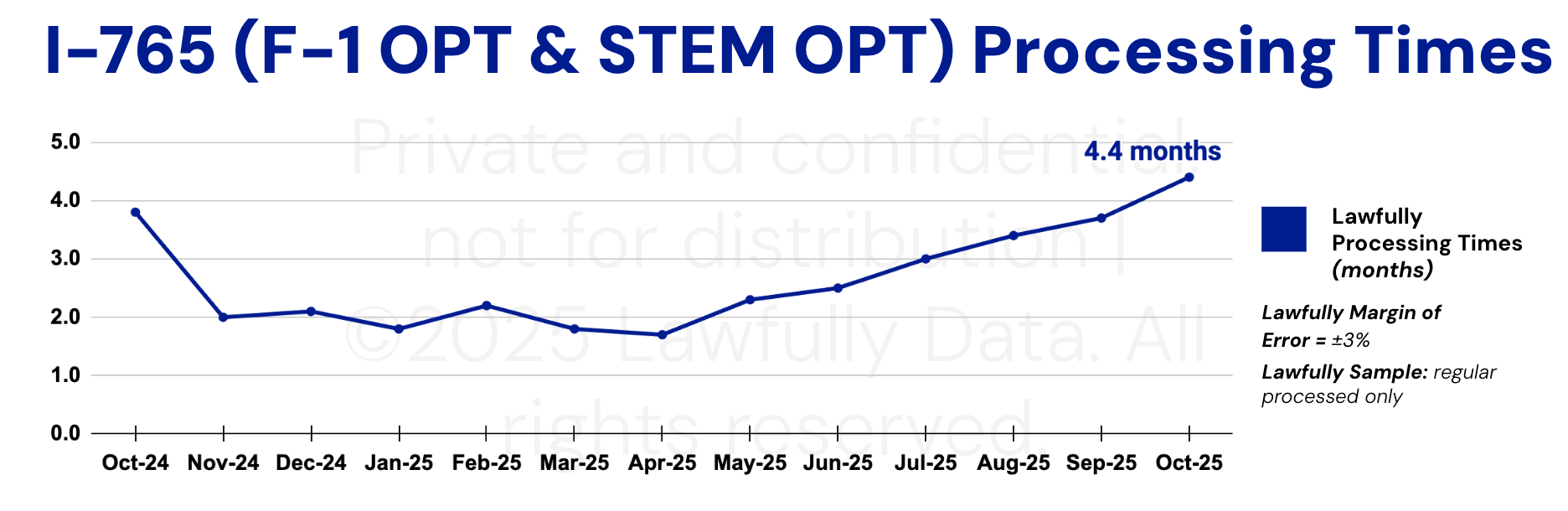 📈 New Data: In Oct, Lawfully tracked a continued increase in I-765 (EAD) processing times for F-1 OPT & STEM OPT applications that started in Apr 2025.